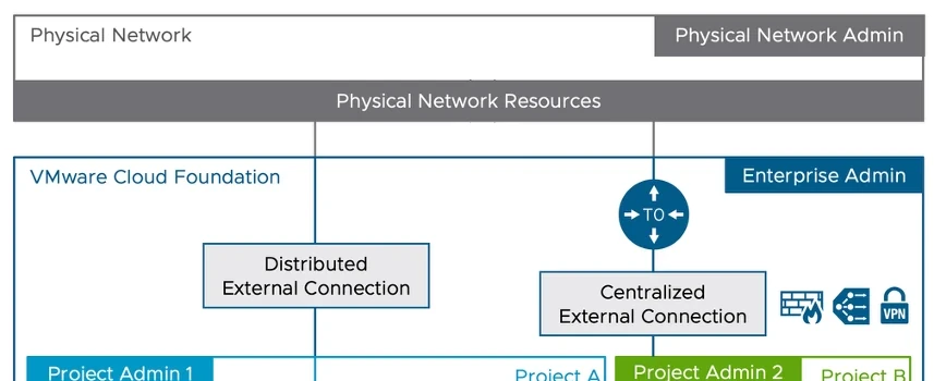 - The Enterprise Admin may have both types of T0’s deployed to be able to offer service-rich or higher-throughput External Connectivity options to the Projects/Tenants below.